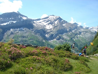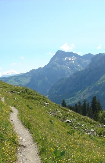 Schöner Ausblick zu den Schneebergen der Berner Alpen vom markanten Spitzchen des Eigers im Osten bis zum Geltenhorn über dem Grat, welcher Spitzhorn und Arpelistock verbindet. Vom Pass bei wechselndem Gefälle über Pfadspuren – zuweilen auch weglos – an der Alphütte Ober Stuedeli vorüber zu den beiden Hütten der Alp Seeberg (zum Arnensee 50 min,; nach Hinter Walig–Feutersoey 2h15). Zwischen den Gebäuden steil hangaufwärts Richtung Seeberghorn. Prächtiger Rückblick übers Tschärzistal mit dem waldumschlossenen Arnensee. Kurz nach dem kleinen Seelein überschreitet man bei Pkt. 1919 nahe dem Chalet Vieux die Kantonsgrenze und wechselt zugleich vom Tschärzistal ins Pillongebiet. Prächtige Sicht ins Diablerets- und Oldengebiet. Steil windet sich der Pfad abwärts und folgt der Hangflanke durch lockeren Waldbestand zum Lac Retaud, einem Kleinod in den Waadtländer Voralpen. Das Fahrsträsschen meidend gehts durch lichten Fichten- und Bergföhrenwald hinab, vorbei an eigenartigen Kuppen und Gipstrichtern zur Passhöhe des Col du Pillon.