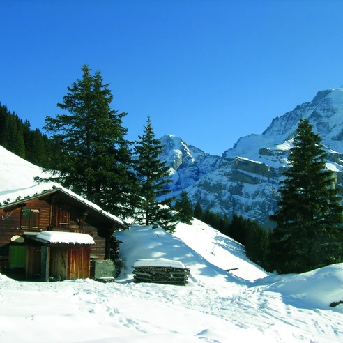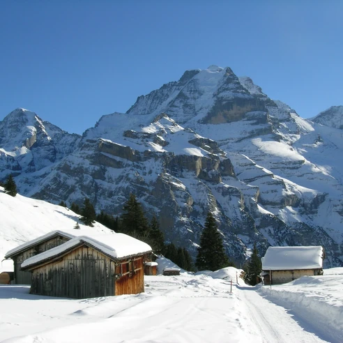Bei den damaligen Mürrner Stammgästen, Angehörigen der britischen höheren Gesellschaft, entwickelte sich daraus rasch ein eigentlicher Winterboom. Um die Nachfrage zu decken, wurde 1912 die Standseilbahn auf den Allmendhubel und gleichzeitig ein Bobsleigh-Run als Schlittelabfahrts-Piste vom Allmendhubel hinunter nach Mürren gebaut. Später begannen die Kühnsten unter den britischen Gästen Mürrens mit Skis zu experimentieren, warfen den bisher bekannten nordischen Skilauf (heute bekannt als Langlauf) über den Haufen und erfanden völlig neue Disziplinen, die unter den Bezeichnungen Abfahrt und Slalom noch heute praktiziert werden. Die Weltwirtschaftskrise der dreissiger Jahre und der Zweite Weltkrieg führten jedoch zu einem Zusammenbruch der Nachfrage und liessen Mürren in touristischer Hinsicht in einen Dornröschenschlaf fallen. Neue Impulse verlieh dem Bergdorf erst wieder der Bau der Schilthornbahn in den sechziger Jahren. Von der Standseilbahn-Bergstation Allmendhubel führt der Winterwanderweg an der Terrasse des Restaurants vorbei zum Waldrand auf der Südseite des Pistengeländes. Wanderer und Schlittler teilen sich hier das nur geringfügig geneigte Trassee. In weitem Bogen und sanftem Abstieg führt der Weg ins Blumental hinunter und zum Restaurant Sonnenberg. Hier verzweigen sich Winterwanderweg und Schlittelabfahrt. Die Wanderer gelangen auf mehr oder weniger gerader Route und in zusehends steiler werdendem Abstieg zum Standort Geissställe. Dort wählt man den links abzweigenden Panoramaweg, der ohne nennenswertes Gefälle in weitem Bogen dem Hang oberhalb des Dorfs entlang führt. Eindrücklich ist der Blick auf die Jungfrau, der sich von hier aus bietet.Nach Unterquerung des Trassees der Allmendhubel-Bahn verläuft der Weg dem Waldrand entlang weiter und senkt sich dann gegen die ersten Häuser und die Bahnstation von Mürren hinunter.