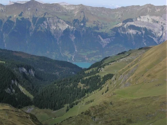The descent is extremely steep at first. In no time, the chain of the Brienzer Rothorn and the Augstmatthorn, the intense turquoise of Lake Brienz at its base, comes into focus. The untamed landscape of the Alp Tschingelfeld is defined by the erosive power of water. While the lower reaches of the Bödeli are relatively flat, there are many steep slopes dotted with rock formations higher up.