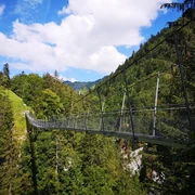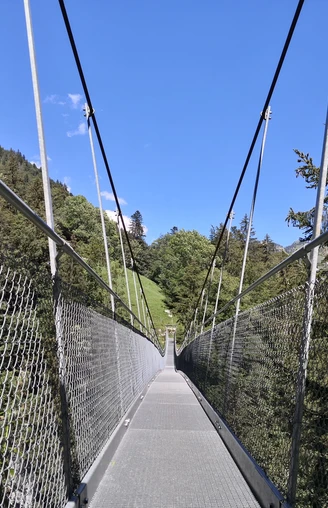 Weiter in Richtung Morgetenpass entlang dem Buuschebach steigt der Weg nun steiler und führt dann über Metalltreppen zur Hängebrücke Leiternweide. Sie ist 111 Meter lang und 111 Meter hoch. Eröffnet im Oktober 2013, erschliesst sie die Alp Leiternweide, die vorher nur mit grossen Umwegen zu erreichen war und ist Teil des historischen Bäderweges. Ab hier folgt man den Wegweiserangaben Oberwil. Abwechselnd eben oder absteigend, durch Wald oder über Weiden, geht es über Mursbrunne nach Buusche. Vom Weiler Buusche aus führt die Wanderung an der Burgruine Weissenburg vorbei hinunter in den gleichnamigen Ort. Nun verbleibt noch ein kurzer Aufstieg zur Bahnhaltestelle Weissenburg, dem Ziel der Wanderung.