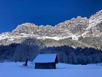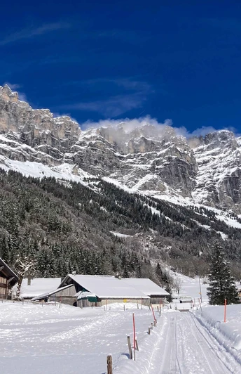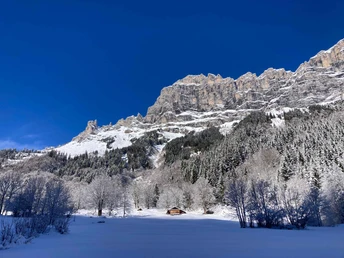 Weiter geht es nun von Gadmen nach Fuhren. Ab und zu poltert es in den Kalkwänden, wenn sich irgendwo Schnee und Steine lösen. Bei winterlichen Verhältnissen ist es schwer vorstellbar, dass die eindrücklichen Felswände im Sommer ein Kletterparadies sind und mit ihren über 100 Mehrseillängenrouten Kletternde aus aller Welt entzücken. In Fuhren gibt es wenige Schritte vom Winterwanderweg und der Bushaltestelle entfernt ein Restaurant, in dem man sich aufwärmen kann.