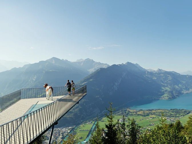 From Interlaken Ost, the hiking trail leads left to the Harderbahn valley station, eastwards towards Goldswil. The steep trail runs zigzag through the dense Buchenwald, via Ried to Hardergrat. Along the ridge, it now leads slightly downhill to the sun terrace of the Harder Kulm mountain house. It offers a fantastic view.