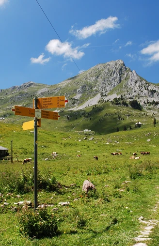 (Beschrieb ab Schwarzsee) Selten ist eine Gegend so sagenreich wie die Landschaft am Schwarzsee. Über dessen Entstehung wird berichtet: Vor Zeiten hat sich hier noch kein See gekräuselt. Prächtige Alpweiden erstreckten sich bis zur Kaiseregg hinauf. Alle Güter gehörten Bernhard Riggi, der trotz seines Reichtums freundlich und freigiebig gegen jedermann blieb. Das gefiel auch den Zwergen, die als Dank sein Vieh beschützten. Anders trieb es sein Sohn und Nachfolger. Er wilderte und gab sich knausrig. Die Zwerge wurden verscheucht. Darauf brach ein furchtbares Gewitter los, das die Alpen verwüstete, den missratenen Sohn in die Tiefe riss und den Talgrund mit Geschiebe bedeckte, so dass sich dahinter die Wassermassen stauten – und ein dunkler See entstand. Von Schwarzsee/ Gypsera nur wenige Schritte talauswärts halten und bei der Kirche bergwärts dem Riggisalpbach entlang ansteigen. Ausserordentlich steil führt der Alpweg durch den Waldgraben hinauf zur Hütte auf dem Hürlisboden. Sanfter ansteigend gehts nun über die aussichtsreiche Alprippe weiter zum Bergsattel in der Salzmatt. Prächtig ist hier der Ausblick in den von den Flühen des Stierengrats begrenzten Alpkessel Schönenboden. Südwärts zieht sich nun ein Pfad durch die abschüssige Weide der Passhöhe entgegen. Ein letzter sehr steiler Anstieg durch die Felsflanke, und der Kaisereggpass ist erreicht. Herrlich schön ist der Tiefblick über die Riggisalp Richtung See und der Ausblick zu den Hochalpen (Wetterhorn bis Rinderhorn, samt Bietschhorn). Weit ausholend führt der Pfad zum mit Karrenzonen durchsetzten Weideplateau der Kaisereggalp hinunter, von wo ein Alpweg den südlichen Trichterrand der Alp Walop streift, in deren Mitte ein hübsches Bergseelein glänzt. Sehr reich ist die Bergflora zwischen Vordere Walop und der Hütte Uf Egg, die man am grünen Walopsee vorbei fast ebenen Wegs erreicht. Noch einmal zeigen sich die Oberländer Gipfel von der Blüemlisalp bis zum Wildhorn in ihrer ganzen Pracht. Nicht besonders kniefreundlich ist der steile Abstieg in den von hohen Felszacken umschlossenen Talkessel der Chlus auf rauem, zuweilen mit Schwellen versehenen Alpweg. Hier trifft man auf das Teersträsschen, das durch den schluchtartigen Engpass der Chlusflue talauswärts über Farni zum Weiler Schwarzenmatt führt. Die dunklen Halden unterwegs erinnern an die einstige Ausbeutung der hier vorhandenen Kohlenflöze. In leichtem Auf und Ab führt nun ein hübscher Wanderweg hinüber ins Tobel des Dorfbachs und hinab nach Boltigen.