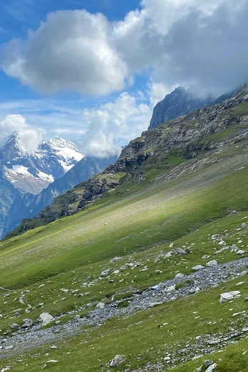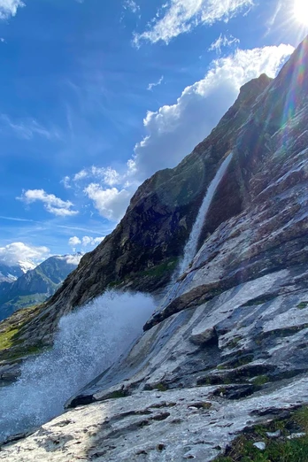 From the small Alpiglen station, head briefly downstream. At the mountain restaurant, the excellently laid out mountain hiking trail branches off in the direction of the Mittellegi ridge and winds very steeply in a zigzag over alpine pastures and through larch forest upwards. A stream deeply incised into the limestone rock is crossed on firmly anchored bridges. A first rest stop is worthwhile at a hairpin bend on the path, as the ice water from the Eiger shoots out powerfully from a rock channel here. As a long, constantly steeply rising traverse along the slope, the path leads over the Langenegggraben along the foot of the Eiger North Face into the valley landscape Im glatten Wang. Impressive are the upward and downward views of the imposing climbing wall, Kleine Scheidegg, and the green Grindelwald valley. Over colorful alpine flower carpets and bare limestone slopes, through snow grooves and scree fields, you reach the Wart viewpoint. Occasionally, climbers in the wall can be observed with binoculars: 150 to 200 climb it each year. During the same period, 3 to 9 people have to be airlifted from the wall. The view into the glacier world from the Eigergletscher station is indescribable. The husky breeding stationed here also supplies the sled dogs at Jungfraujoch.