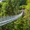 From the STI stop "Sundlauenen village" it goes up over asphalt road to the lakeside road. There, the hiking route leads through the forest to Ruchenbühl—a first steep ascent is accomplished. A meadow path finally leads to the single-rope suspension bridge. High above the Sundgraben, standing on metal grates, you can catch a view of Lake Thun. The suspension bridge leads the hikers in a gentle left curve and by means of stairs back onto solid ground up into the shady Schwendi forest area. Before going upwards again, the route crosses a larger stream on a wooden bridge. The path to Beatenberg is anyway lined with many small water streams that have created an enchanting landscape. It is worth stepping away here and there from the actual hiking trail to enjoy views through the bright branches of the Lake Thun region or the mirrored worlds of the small water spots. Most of this long forest section towards Beatenberg is characterized by stair landings. The last section up to Beatenberg Church leads over meadows.