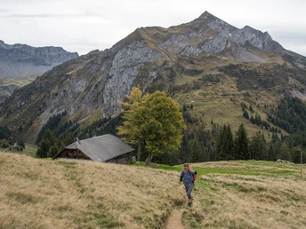 Von der Brunnihütte steigen wir der Beschilderung folgend in Richtung Greberegg ab und wandern über einen schönen Gratabschnitt mit Aussicht auf den Thunersee. Bei der Wegkreuzung Greberegg geht es links Richtung Suld, nach 200 m ist die Alphütte Greberegg erreicht. Von hier sieht man zur Brunnihütte mit dem darüber aufragenden Morgenberghorn, über dem Talschluss thront die Schwalmere und rechts davon die First und der Dreispitz. Wir steigen nach links ab und erreichen über einen steilen und schönen Waldweg das Gasthaus Suld.