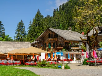 From Suld it is best to first stay on the left side of the Sulbach. First through forest and over clearings, then along the brook's bank the well-developed path winds downhill through the Suldtal. After about one and a half kilometers a bridge leads to the right bank, and shortly afterwards at the wayside is a lovingly arranged picnic and barbecue place. Soon afterwards the path splits. Upwards it goes comfortably and directly back to Aeschiried. Following the brook further is the recommended, wilder, and somewhat longer route. The path soon changes banks and follows sometimes at a height, sometimes closer to the water, and occasionally also on a shaky wooden footbridge of the Suld. On the narrow path, surefootedness is again required.