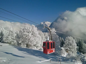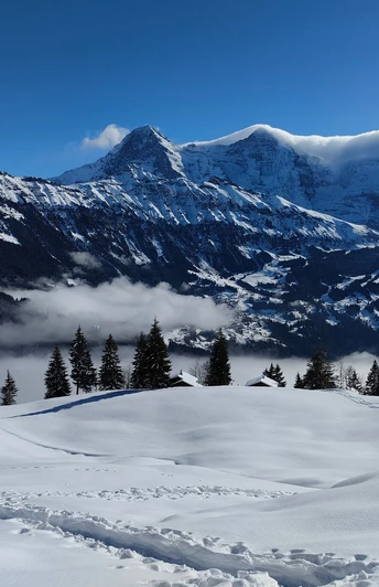 A highlight right at the start: the ride with the iconic red cable car from Isenfluh to the starting point Sulwald. Two snowshoe routes with wonderful panorama lead from Sulwald Stübli to Stutz, a little further the easier Sulwald Trail branches off to the right uphill over Bergherrenhus. Via Mederalp it goes uphill with a splendid view into the Lauterbrunnen valley and of Eiger, Mönch and Jungfrau. At the highest point Haltenmad you look into the Ahornigrabe and down into the valley. The path then goes steeply downhill over snowy meadows and leads back on the road to Sulwald Stübli. The medium-difficulty Lobhorn Trail continues from the junction to the Lobhorn hut, where there is a wonderful place to stop for food and overnight. If you like, you can inquire at the hut beforehand and have fresh groceries transported up.
