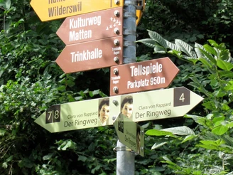 Turn off the motorway at the Interlaken West exit and head towards Interlaken for 5 minutes via Därligstrasse, Waldeggstrasse and Wychelstrasse; at the Hotel Sonne, turn off for the car park on Tellweg at the ice rink/Tell Spiele. The walk to the starting point takes 5-8 minutes.