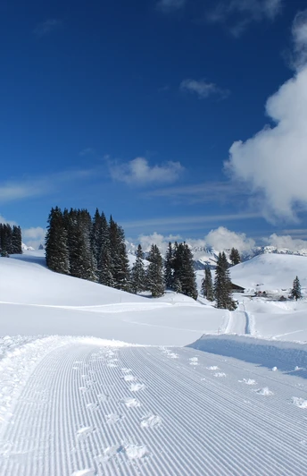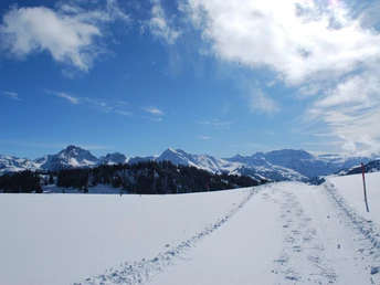 If a composer were tasked with scoring this hike, he would probably use his “film music” quite dramatically: with drum rolls and fanfares the scene would be unveiled, upon which the forthcoming landscape drama would unfold – a decidedly cheerful and delightful drama. The groomed circular trail prepared by a piste vehicle begins at the bus terminus near the Hotel Sparenmoos. Gently ascending, it leads southwest along the slope. Step by step, a wonderful panorama gradually spreads. With each step, the view broadens over the extensive community of Saanen and the mountain peaks dressed in winter covering that surround the wide plain. At the stately alpine hut Vordere Hüsliberg, the trail turns north. Here you have to decide: those who want to hike the classic circular trail take the left path at the fork; those content with the shorter option take the right path (which leads back to Sparemoos in about 40 minutes).