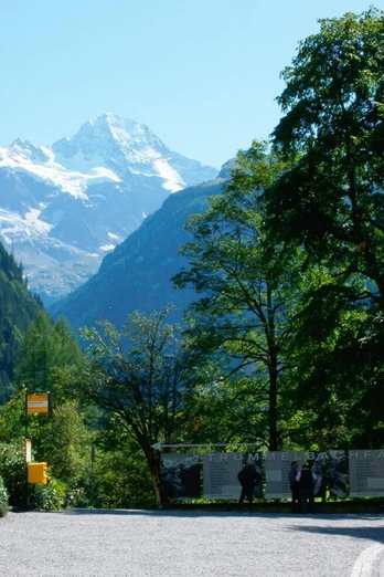 For only a short time, you follow the main road inland from Lauterbrunnen station. Then the hiking trail turns left into the valley floor and becomes the riverside path along the Weisse Lütschine. The spectacle of the Staubbach Falls, which at about 300 m is one of the most impressive waterfalls in Europe, is wonderful. Particularly pleasing is the fact that the municipality of Lauterbrunnen was able to purchase the Staubbachhubel in 1996 and thus ensure free access to the falls. In the background of the valley, the silver ribbons of the Schmadribach stretch over the rocks. Above, the glacier walls at the Gross- and the Breithorn gleam. After a short detour to the foot of the Mürrenflue Bir Buechen, the path crosses the valley floor to the Hotel Trümmelbach. About 300 m further inland, a field path leads to the foot of the steep slope. The further path is only suitable for experienced mountain hikers!
