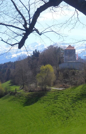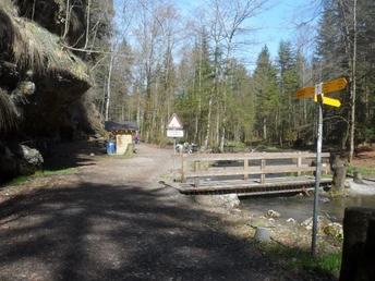 From the turning loop of the bus from Thun, the path runs along the edge of the forest towards Allmendingen Amerika. After about 1.5 km, the trail crosses the Glütschbach, which gives its name to the valley ahead. Until the early 18th century, the Kander flowed here. On the left is a small cave that can be illuminated by pedal power. Before reaching the Guntelsey shooting range, the eye falls on dripstone caves located to the right of the path. Resting places invite you to linger. The hiking trail then winds along the gently gurgling Glütschbach to the fork at the "Alti Schlyffi." From here, a detour to the Strättligturm is recommended (+1 hour there and back). Here the route leaves the Glütschbach to flow into the Kander valley after 20 minutes.