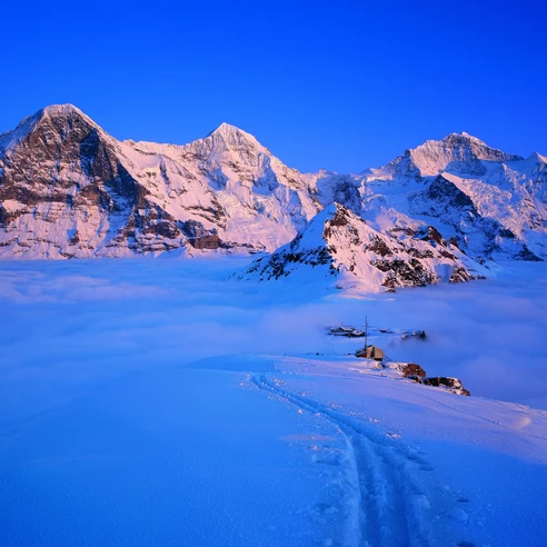 Für diese Winterwanderung ist kein allzu frühes Aufstehen nötig: Wegen der Sonneneinstrahlung sollte man im Dezember und Januar erst gegen 11 Uhr vom Männlichen losziehen. Man verlässt dessen Gondelstation in süd-südöstlicher Richtung mit Blick auf die imposante Eigernordwand, den Mönch und die Jungfrau. Anders als im Sommer führt der Wanderweg in der kalten Jahreszeit den Hang hinunter, und dies teilweise recht steil. Es gilt, mehrere Skipisten zu überqueren und gleichzeitig die Markierungen des Wanderwegs nicht aus den Augen zu verlieren. Eine je nach Schneebeschaffenheit etwas heikle Piste trifft man gegen das Ende des Skigebiets an. Hier können Stöcke beim Queren der Flanke nützlich sein. Danach folgt der stillste Abschnitt. Unvermittelt taucht ein alter Arvenwald auf, der zum Träumen und einer Pause einlädt. Danach begibt man sich bei Bustiglen ins nächste Skigebiet. Hier ist der vorläufig unterste Punkt der Wanderung erreicht. Nun führt der Winterwanderweg stetig hinauf zur Kleinen Scheidegg mit dem imposanten Hotel Bellevue des Alpes, einem Grandhotel mit historischer Einrichtung. Das Dreigestirn Eiger, Mönch und Jungfrau scheint hier zum Greifen nah.Ab jetzt verläuft der Winterwanderweg leicht abwärts in südwestlicher Richtung. Nun ist gegenseitige Rücksichtnahme noch wichtiger, denn man teilt sich den Wanderweg mit Schlittlerinnen und Schlittlern. Vereinzelt sind sogar Familien auf Skis anzutreffen. Wegen des sanften Gefälles ist jedoch niemand so schnell unterwegs, dass Kollisionen zu befürchten wären. Nach gut zweieinhalb Stunden erreicht man die Wengernalp. Auf der Sonnenterrasse des Hotels Jungfrau Wengernalp lässt sich die Zeit bis zur Abfahrt der Wengernalpbahn genussvoll überbrücken.
