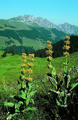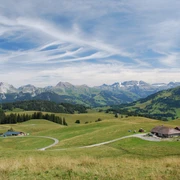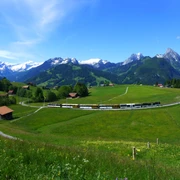 Dank der sonnigen Höhenlage und der frühen Erschliessung durch Strasse und Montreux-Oberland-Bahn (MOB) entwickelte sich Schönried rasch zum beliebten Ferienort. Von der Station aus die Hauptstrasse queren und dem kleinen Bach entlang hinauf zu den Häusern auf dem Hubel. Sanft steigt das Strässchen Richtung Bergmatte/Sumeli an (nach Saanenmöser 15 min; über Grossi Vorschess zum Rellerligrat 1h30) und zieht sich später in den waldigen Simnegrabe hinein. Unterwegs weitet sich der Blick durchs Tal der Kleinen Simme und über die Flanke des Rinderbergs zur Spillgerte-Gruppe. Bei Simne wechselt das Alpsträsschen auf die andere Talseite, entfernt sich mehr und mehr von der jungen Kleinen Simme und steigt schliesslich in vielen Windungen steil zur Bire-Hütte empor. Bei der stattlichen Alphütte ist bei klarem Wetter über dem Sanetschpass das breite Massiv des Grand Combin in den Walliser Alpen zu sehen. Nun schwenkt man in leichtem Auf und Ab westwärts in die Südflanke des Schneitgrates um und erreicht an den Hütten von Vorderi Schneit vorüber vorerst sanft ab-, dann wieder leicht ansteigend den Fuss des Planihubels. Diesen auf dessen Westflanke umgehen und durch Wald zu Pt. 1806 halten (nach Grossi Vorschess–Saanenmöser 1h15). Der leichte Anstieg zum Hugeligrat, dem höchsten Punkt der Wanderung, beschert erneut eine herrliche Fernsicht auf Vor- und Hochalpenwelt des Saanenlandes. Bald ist auch die vorgelagerte Kuppe des Rellerligrates (nach Grossi Vorschess–Saanenmöser 1h20; Hugeli–Schönried 1h) mit Bergstation der von Schönried herauf führenden Gondelbahn erreicht. Für besonders Abenteuerlustige steht bei schönem Wetter sogar eine 620 m lange Sommerrodelbahn zur Verfügung. Nun über den steil abfallenden Bergrücken zur Alphütte Rittmal, wo im Mittelalter eine Hochwacht (ein sogenannter Chutz) stand, welche die Feuersignale bei Gefahr von Flüeweid ob St. Stephan nach Rougemont und Château-d’Œx weiterleitete. Im Zickzack gehts über die Ostflanke des Rellerligrates steil hinunter nach Gspan (nach Saanen 1h). Auch im WEiterabstieg nach Grüebli entzückt der umfassende Ausblick in die Saanenländer Bergwelt. Nun schwenkt der Alpweg ostwärts in den Burrisgrabe um und senkt sich gemächlich hinunter nach Schönried.