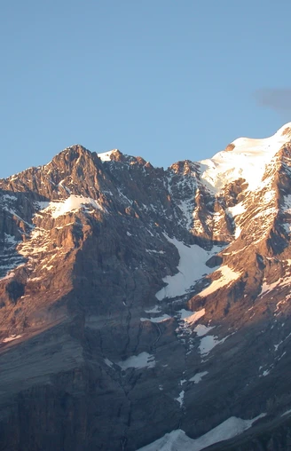 Der Abstieg nach Obersteinberg führt zuerst zurück zu Pkt. 1978 und dann einer stark abfallenden Grashalde entlang. Der Weg ist stellenweise felsig, Vorsicht ist darum angebracht! Auch die Aussicht von der Hotelterrasse lässt keine Wünsche offen: Zahlreiche Wildwasser und Gletscherbäche rauschen in der Tiefe, während an den Berghängen zwischen Jungfrau und Tschingelhorn die Hängegletscher gleissen (nach Pfäffer–Gimmelwald 2h10; nach Trachsellauenen–Stechelberg 1h40).