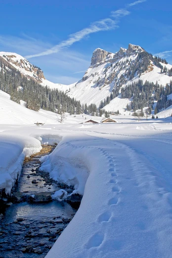 The Justistal, the entrance to which is clearly marked by the distinctive Niederhorn, is a snow-sure winter paradise. Its name comes from Justus, a monk who once spread the gospel in the Lake Thun area together with his fellow monk and companion Beatus.The groomed winter hiking trail starts in a gentle descent from Grön, running parallel to the cross-country skiing trail alongside the Grönbach stream, which flows into Lake Thun in Merligen. Glittering ice formations, created each winter anew, flank the trail. The route continues past the Spycherberg, which sets the stage every autumn for the legendary "Chästeilet", in which the cheese from a summer’s alp grazing is divided between the farmers according to their cattle’s milk yield.From here, the impressive, maybe somewhat mystical valley floor of the Justistal opens up with a view of the Hindersberg alp hut, and, right at the rear of the valley, the Sichel, a crescent-shaped pass crossing to the west of the Sieben Hengste to Eriz in the Zulgtal valley. The return journey on this easy and remote trail leads by the same route back to the starting point.