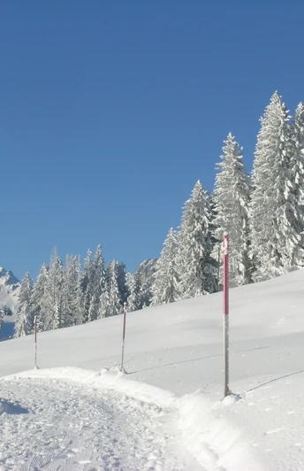 The Jaunpass is a small but fine winter sports area including a cross-country ski trail. Winter hikers also enjoy it here. A 2.7 km long circular route on the pass summit is even illuminated on some evenings per week. The winter hiking trail to Bäderegg begins at the valley station of the Zügwegen ski lift, which is located just behind the reception of the campsite. The route initially follows the ski lift track, then after 50 m turns left and leads along the edge of the ski slope in a gentle ascent upwards. It then continues onto the alpine lane to Bädermoos. In a wide bend, you reach the wintery mountain forest and deep snow-covered alpine meadows. A particularly charming sight is provided by the wild peaks of the Gastlosen, which are rightfully called the "Dolomites of Switzerland." At the edge of the Chuchifang nature reserve, the groomed path turns right and leads without significant altitude differences over the ridge to Bäderegg. The viewpoint offers a charming view of the Simmental mountain world. The return to Jaunpass follows the same route.