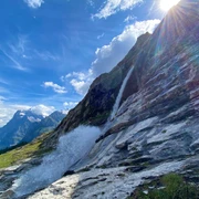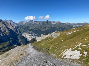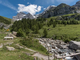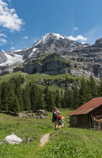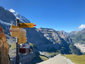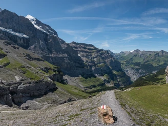 Beim Austieg aus dem Zug an der Station Eigergletscher sticht einem unweigerlich die gewaltige Nordwand des Eigers ins Auge. Die Wanderung beginnt allerdings in die entgegengesetzte Richtung. Hinter der Bergstation führt der Weg über den schmalen Moränenrücken abwärts bis zur Wegkreuzung Haaregg. Geradeaus steigt man über den nun breiten Bergrücken weiter ab, während mehr und mehr Kiefern den Wegesrand schmücken. Nach einer Linkskehre geht es im Wald abwärts – vorbei an der Wegkreuzung Wyssi Flue – bis hinab zur einsamen und herrlich gelegenen Biglenalp, wo eine Bank am Bach zu einer Pause einlädt. Auf den nächsten rund drei Kilometern verliert man praktisch kaum an Höhe. Anfangs durch Wald, später über Alpwiesen führt der Weg an der Mettlenalp vorbei. Kurznach den Alphütten verlassen wir die Alpstrasse nach links und steigen erneut auf einem Bergweg Richtung Stalden ab. Dem Mendelssohnweg (die Wanderroute zwischen Wengen und Wengernalp) folgend trifft man auf die Staldefluh (auf 1600 m, mit Sitzbank), wo sich einem ein beeindruckendes Panorama ins Lauterbrunnental auftut. Auf dem weiteren Abstieg durch den Wald erblickt man auf der anderen Talseite den Staubbachfall. Nach dem der Weg den Wald verlässt, erreicht man den kleinen Ort Schiltwald. Von der Kreuzung P.1310 kann man optional einen Abstecher nach links zum Staubbachbänkli machen – wie der Name schon sagt mit einem schönen Blick zum berühmten Wasserfall oberhalb von Lauterbrunnen. Dem Wanderweg via Stutzweidli folgend ist der Bahnhof der autofreien Ortschaft Wengen in etwas mehr als einer halben Stunde erreicht.