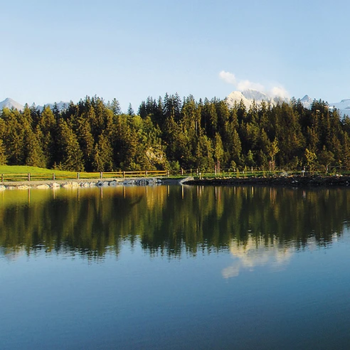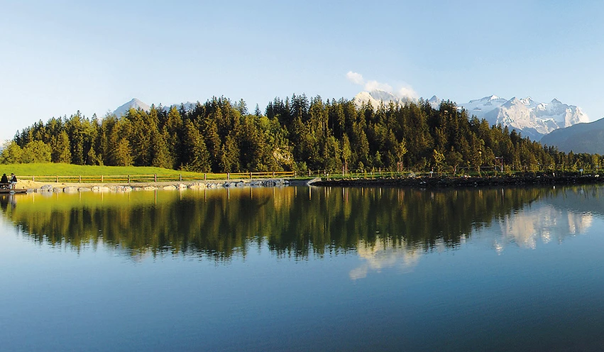 Gleich neben der Gondelbahnstation Bidmi befindet sich ein kleines Seelein. Zum Baden ist es nicht geeignet, doch der Picknickplatz im Wäldchen nebenan lockt zu einem ersten Zwischenhalt für jene kleinen und grossen Entdecker, die bereits auf dem Muggestutz-Themenweg (siehe Varianten) gewandert sind. Zwei Wege führen von von hier nach Wasserwendi. Das Asphaltsträsschen links wird vor allem im Winter genutzt. Im Sommer ist die Abzweigung rechts vorzuziehen. Sie verläuft zunächst ebenfalls einige Schritte auf Hartbelag, zweigt dann aber links ab und führt auf einem gut ausgebauten, breiten Kiesweg durch reizvollen Bergwald und über blumenreiche Alpwiesen. Unterwegs schweift der Blick zur Rosenlaui auf der gegenüberliegenden Seite des Haslitals – das Gebiet gilt als eine der schönsten Naturlandschaften des ganzen Alpenraums. Lieblich zieht sich der Reichenbach dort durch den grünen Talboden, darüber ragen schroff die wild gezackten Engelhörner auf, und im Hintergrund glänzen malerisch die eisigen Gipfel von Rosenhorn und Wetterhorn. An locker verstreuten Ställen und einzelnen Ferienhäuschen vorbei geht es leicht abwärts. Im Gebiet Fuhri hält man sich an die Wegweiser-Signalisation Richtung Wasserwendi und gelangt auf schmalem Pfad praktisch ebenen Wegs zum Trassee der Gondelbahn Hasliberg-Käserstatt. Nach dessen Unterquerung wird talwärts abgezweigt. Steil über Weideland abwärts gelangt man zu den ersten Häusern von Hasliberg/Wasserwendi, danach auf einem Strässchen zum gleichnamigen Restaurant. Hier bietet sich eine herrliche Aussicht zum Brienzersee mit der darüberstehenden Kette von Rothorn und Augstmatthorn. Auf breitem, aussichtsreichem Kiesweg geht es nun über Wysstanne nach Hasliberg/Hohfluh. Am Weg liegt der vor wenigen Jahren künstlich angelegte, sich ausgesprochen harmonisch in die Berglandschaft fügende Badesee Hasliberg. Dank der geringen Tiefe erwärmt sich das Wasser bereits im Frühsommer rasch auf angenehme Temperaturen. Ein kleiner Sandstrand, Liegewiesen und Strandkörbe bereiten auch Wandernden ein angenehmes Badeerlebnis.
