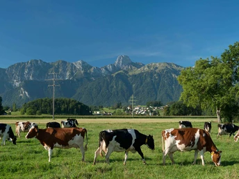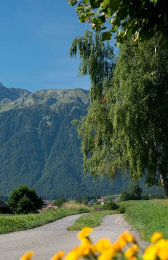 Alsbald schon nimmt die Gegend deutlich ländliche Züge an: Weite Grasflächen, einige Äcker, dazwischen dichter Wald und ausgedehnte Hecken prägen das Gesicht der Landschaft. Am Gehöft Nussbaummatt vorüber gelangt man zum Rosindlirain und von dort, in leichtem Aufstieg, zum Weiler Willerüti. Hier zweigt die Route rechtwinklig nach Süden ab. Der Blick auf das Aaretal, die wild gezackte Kette des Sigriswiler Rothorns und die eisgekrönten Berner Hochalpen ist zauberhaft. Nun folgt ein kleines, verträumtes Wäldchen, in dem sich die Wanderwege verzweigen. Hier hält man geradeaus, gelangt bald wieder auf offenes Gelände und erreicht an mehreren Einzelhöfen vorbei den Thieracher Ortsteil Wahlen.