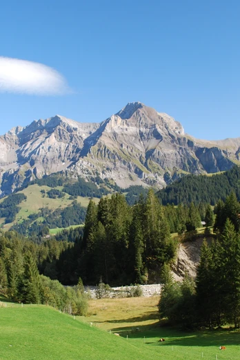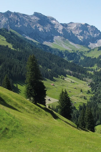 Steil und schweisstreibend ist der Aufstieg vom Dorfzentrum Adelboden am Parkhotel Bellevue vorbei und durch den Schutzwald oberhalb des Dorfs. Fast mit jedem Höhenmeter umfassender wird die Sicht auf den weiten Talboden, den im Hintergrund der mächtige Kessel der Engstligenalp abschliesst. Beim Uelisgraben enden die Serpentinen, in leichterem Anstieg geht es zur Flueweid. Erneut weitet sich die Perspektive: Fast wie aus der Vogelschau überblickt man den deutlich als Streusiedlung erkennbaren Ortsteil Stigelschwand. Er liegt im Tal des Allebachs, das von den breiten Flanken des Albristhorns beherrscht wird. Zunächst in leichtem Abstieg bei der Wannegg, danach praktisch ebenen Wegs gelangt man auf schmalem Pfad an duftenden Blumenwiesen vorüber taleinwärts – ein Wandervergnügen par excellence. Beim Stigelbach-Graben geht es dem Waldrand entlang zur Schärmtanne hinunter (das gleichnamige Restaurant liegt auf der anderen Seite des Waldstreifens), danach steigt man zum Allebach ab, dem ein breiter Kiesweg auf dem rechten Ufer folgt. Auf diesem gelangt man über Rehärti zur Steinige Brügg und von dort zurück in den Dorfkern von Adelboden.