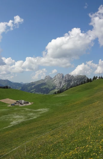 Ein kurzer Kiesweg führt von der Bushaltestelle auf dem Jaunpass zum Strässchen, das die Alpwirtschaftsbetriebe im Gebiet Bäderberg erschliesst. In weiten Schleifen geht es sanft aufwärts, teilweise im Wald, mehrheitlich aber über offenes Weideland. Bis kurz vor Grosse Bäder muss Hartbelag in Kauf genommen werden. Der weite Ausblick auf das Saanenland, die angrenzenden Waadtländer Berge und die zum Greifen nahen Zackenformationen der Gastlosen vermag einen immerhin darüber hinwegzutrösten. Beim Alpwirtschaftsbetrieb im Grossen Bäder lohnt sich ein kurzer Zwischenhalt. Die Sennenfamilie stellt nicht nur würzigen Bergkäse und Mutschler aus Kuhmilch her, sondern auch ungewöhnliche Geisskäse-Variationen mit Kräutern oder Kümmel. Nach dem Bäderberg führt der Weg zunächst geradeaus dem Hang entlang weiter, verengt sich dann zum Bergpfad und steigt leicht an nach Buufeli. Weiter geht es in leichtem Auf und Ab über Uf Pfad zum Zitbode und von da, stets die markante Felsbastion des Bäderhorns zur Linken, zurück zum Bäderberg. Die Rückkehr über den Grossen Bäder zum Jaunpass erfolgt in umgekehrter Richtung auf gleicher Strecke wie zu Beginn der Wanderung.