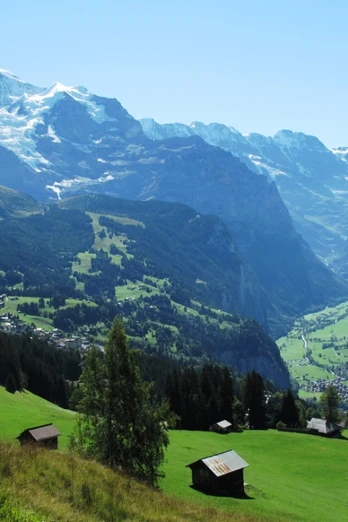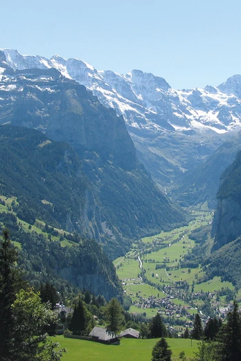Vom Bahnhof Wengen wird das Ortszentrum auf der Dorfstrasse durchquert. Kurz vor der Kirche zweigt man hangwärts ab und gelangt zunächst weiter auf dem Strässchen, danach steil auf einem Treppenweg und, wieder mit geringerer Steigung, auf einem schattigen Waldweg in die Höhe. In der Flanke des Männlichen zieht sich die Route in mehreren weiten Schwüngen langsam talauswärts. In der Äusseren Allmend lohnt sich ein Zwischenhalt: Der Blick auf das langgezogene, tief eingeschnittene Lauterbrunnental ist prachtvoll. Beherrscht wird die Szenerie vom majestätischen Jungfrau-Massiv. Über würzig duftende Alpweiden und durch schattigen Bergwald erreicht man das Leiterhorn. Der Aussichtspunkt gewährt einen herrlichen Panoramablick auf das Lauterbrunnental. Eine ganze Reihe von Sitzbänken sowie eine gut eingerichtete Feuerstelle laden zum Rasten ein. Anders als es der Flurname suggeriert, handelt es sich beim Leiterhorn nicht um einen eigentlichen Berg. Immerhin fällt das Terrain steil in Richtung von Zweilütschinen und dem Bödeli ab. Deshalb besteht auch in nördlicher Richtung eine prachtvolle Aussicht. Um in deren Genuss zu kommen, steigt man im Wald nochmals fünf Minuten an und gelangt zu einer mit Geländern ausgestatteten Aussichtskanzel. Der Abstieg nach Wengen verläuft bei herrlichem Blick taleinwärts dem Waldrand entlang bis zum Aussichtspunkt Hunnenflue. Von dort geht es zurück ins Dorfzentrum von Wengen.