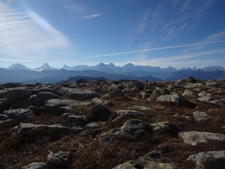 Pünktlich zum Znüni um 9 Uhr haben wir den Gipfel erreicht. Verblüfft sind wir einerseits ab der gewaltigen Rundumsicht die unseren Blick unersättlich umherschweifen lässt. Andererseits sind wir erstaunt ab der riesigen Fläche des Hohgantgipfels oder besser dessen Hochplateaus welches von Millionen von Steinen durchzogen wird.