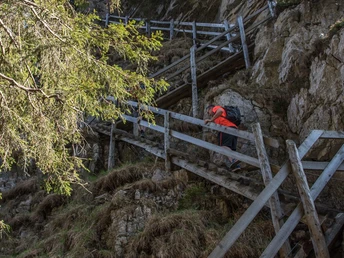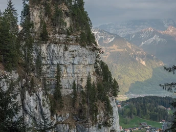 Wir steigen von der Bire ab und gehen westwärts auf teilweise ziemlich ausgesetztem Wege entlang der Flue weiter. Bei der ersten Abzweigung halten wir uns rechts und steigen rund 60 Meter aufwärts bis zum Wegweiser Bireflue. Links folgt man dem Wanderweg in Richtung Känzeli-Beatenberg, welcher noch eine Weile entlang der Felswände führt. Bei der nächsten Abzweigung P.1421 hat man die Bireflue hinter sich gelassen. Links könnte man nach Beatenberg Wydi absteigen, unsere Route führt aber geradeaus weiter. Wir erreichen eine Alpstrasse und der weiss-rot-weiss markierte Weg wird durch gelbe Markierungen abgelöst, welche uns abwärts über Rossi zurück zur Station Beatenberg leiten.