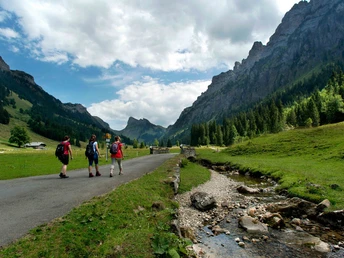 Steil ragen die Flanken des Sigriswiler- und des Güggisgrats beim Eingang des Justistales auf. Die gut befestigten Strassen am Eingang des Tales sind denn auch gesäumt von grossen Findlingen dieser beeindruckenden Bergrücken. Die Wanderung führt weiter via «Püfel» zum «Gross Mittelberg» und zum «Hinterstberg». Die Strecke hat nur ganz wenig Steigung und führt über eine gut ausgebaute Strasse durchs Tal. Dann kommt der eigentliche Aufstieg zur «Sichle», die sich schon beim Taleingang eindrücklich präsentiert. Beim letzten Alpbetrieb, wo eine kleine Stärkung eingenommen werden kann, beginnt schliesslich der eigentliche Bergwanderweg. Ein ruppiger Aufstieg über Stock und Stein lässt so manchen Wanderer immer wieder innehalten und ein wenig verschnaufen. Der Bergwanderweg verengt sich zur «Sichle» hin immer mehr. Dort angekommen, offenbart sich der Pass als schmaler Grat zwischen zwei Gipfeln mit Aussichten auf das hügelige Emmental und auf das Berner Oberland mit dem prägnanten Niesen und dem Frutigland. Auf einem schmalen Wiesenpfad geht es schliesslich von der «Sichle» hinab Richtung Eriztal. Dann wird‘s felsig und steinig, mehrere Runsen müssen überwunden werden, bis die «Obere Schörizhütte» erreicht ist. Bis dorthin können auch die verschiedenen Gesteinsschichten der «Sieben Hengste» bewundert werden. Via «Untere Schörizhütte» führen Natur- und asphaltierte Strassen zum Restaurant Säge in Innereriz mit der gleichnamigen STI-Bushaltestelle.