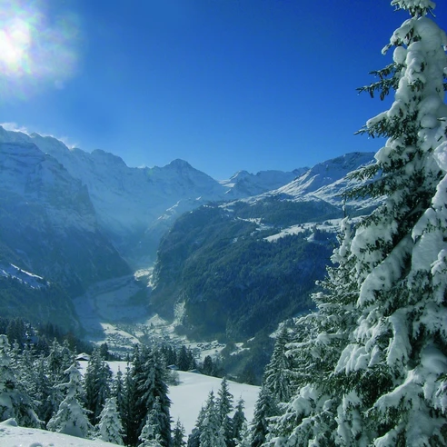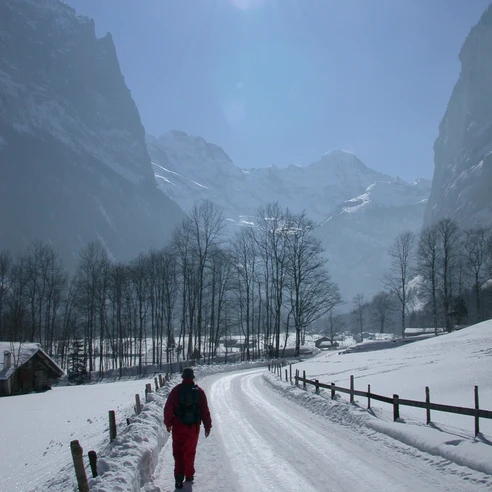 Vom Bahnhof Lauterbrunnen geht es zunächst der Dorfstrasse entlang zum Hotel Schützen. Der Staubbach ist im Winter nur ein dünnes Rinnsal, das sogleich zu einem kaum sichtbaren Hauch zerstiebt. Dennoch führt das stete Fliessen in sehr kalten Nächten zu bezaubernden, gewaltig grossen Eiszapfen-Formationen. Unter der Einwirkung der Sonne stürzen diese tagsüber mit eindrücklichem Donnern in die Tiefe. Grosshorn, Breithorn und Mittaghorn bilden im Talhintergrund eine majestätische Kulisse. Der Weg führt über ein verkehrsarmes Strässchen immer südlich und geradeaus weiter, vorbei an der Abzweigung «Bir Buechen», zur Stägmatta. Hier geht die Route erneut in einen Fussweg über, der durch lichten Auenwald entlang der Lütschine an den Häusern von Lengwald und Matta vorüber zum Zielpunkt Stechelberg führt.