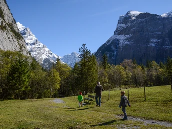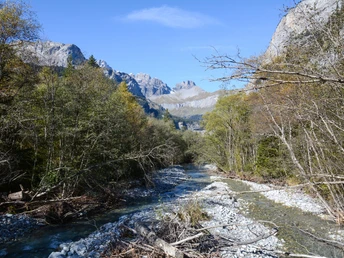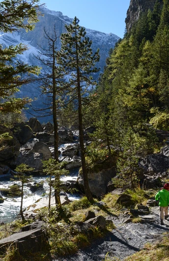 Von der Talstation Sunnbüel bei Eggeschwand weist uns ein Schild den Weg in die schmale, linkerhand liegende Schlucht, welche den Eingang ins Gasterntal anzeigt. Das erste Wegstück durch die enge Schlucht (Chluse) ist teilweise etwas steil und felsig. Nachdem der Wanderweg die Kander zum zweiten Mal über eine Brücke kreuzt, öffnet sich das Tal langsam in seiner ganzen Pracht: die Kander verzweigt sich in mehrere Arme und der rechtsseitig verlaufende Weg gibt einen immer eindrücklicheren Blick auf die gewaltige Bergkulisse frei. Bald überqueren wir den rechten Seitenarm der Kander und kommen durch ein Waldstück zum wunderschön gelegenen Gasthaus Waldhaus – ein idealer Platz für eine erste Pause.