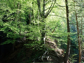 Der Weg beginnt mit einem Abstieg. Bald hört man einheimische Vögel pfeifen. Der Blick fällt auf die eindrückliche Nagelfluh der Tschingelfluh. An einer Säule findet man Infos zu Wald und Holz, daneben ist ein Rastplatz. Weiter führt der Weg über eine Brücke mit atemberaubendem Blick in die tiefe Schlucht hinunter zum Bachbett mit seinen grossen Steinen, den Findlingen. In kleinen Kurven steigt der Waldweg leicht an. Eine Sitzbank lädt ein zu einer Pause inmitten der Natur. Wieder unterwegs folgt ein kleines Tal, das „fischtere Gräbli“. Besonders reizvoll ist dieses im Mai wenn der grün-weisse Bärlauchteppich den Boden bedeckt. Richtung Aeschlen überquert man eine Brücke. Die hochinteressante Gesteinsformation der Nagelfluh aus den gerundeten Steinen (Granit, Gneis, Kalkstein u.a.) sieht man hier ganz aus der Nähe. Dem Wegweiser Aeschlen folgend steigt man hoch, verlässt den Wald und erreicht unweit der Panoramabrücke das Hotel Panorama Aeschlen.