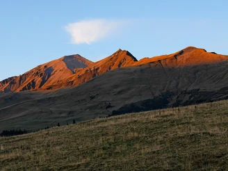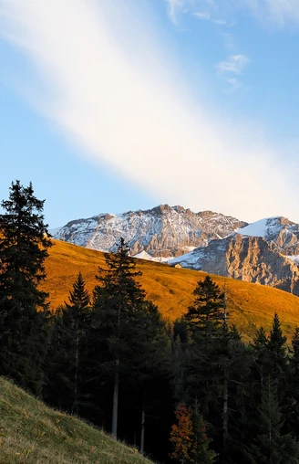 Der Ausblick über die ausgeprägte Hochmoorsenke zum Wildstrubel-Wildhorn-Massiv und ins grüne Obersimmental ist unvergleichlich. Von der Passhöhe erst auf dem alten Saumweg über Weiden zum schön gelegenen Ausflugs-Restaurant auf dem Büelberg. Im Talgrund liegt das Wanderziel, die Lenk. Darüber sind die Reihe der Passübergänge nach Lauenen und der beeindruckende Wildhorn-Rawil-Wildstrubel-Abschluss zu sehen. Anschliessend über den steilen Rasenhang hinunter zur Feriensiedlung auf der Brandegg. Über blumenreiche Bergmatten führt schliesslich ein steiler Pfad dem Rand des Sitewalds entlang hinunter in den Ferien- und Bäderort Lenk.