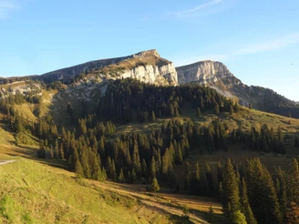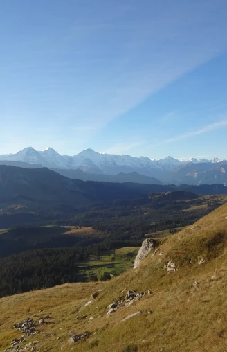 Herrlicher Ausblick über das Quellgebiet der Emme zu den Hochalpen. Durch lockeren Bergwald und karge Alpweiden führt der Pfad in ein grosses Schotterfeld, das im Kessel zwischen Steinige Matte und dem Hauptgipfel des Hohgant liegt (Pkt. 1897). Der Aufstieg zum Furggengütsch dauert aber nochmals rund eine Stunde. Die Anstrengung wird mit einer grossartigen Panoramasicht belohnt, welche vom Säntis bis zu den Waadtländer Alpen reicht. Gewaltig ist aber auch der Ausblick nordwärts über das Emmental zu den Hügeln des Mittellandes und zum Jura.