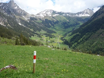 Ein schmaler Hangpfad zieht sich nun fast horizontal durch Fichtenbestände, Schuttkegel und breite Lawinenzüge dahin. Für den aufmerksamen Wanderer gibt es dabei viel zu entdecken: Orchideen im Felsschutt, Apollofalter im warmen Aufwind, giftige Aspisvipern manchmal mitten auf dem Weg! Durch sumpfigen Weideboden ansteigend erreicht man die Alp Am undere Bluttlig. Auch hier besteht wieder die Möglichkeit, die recht anstrengende Tour abzukürzen (nach Büel–Stalde 45 min). Steil zieht sich der Pfad nun Richtung Grimmifurggi (Übergang ins Diemtigtal) hinauf zur Alphütte Am obere Bluttlig. Die Anstrengung wird mit einer wunderbaren Höhenwanderung durch die Färmelmeder (höchster Punkt der Rundwanderung) belohnt: Rauflihorn, Türmlihore, Gsür und Albristhorn schliessen den Talkessel des Färmelberges eindrücklich ab. Über die Alp Muri und durch Wald gehts steil hinunter in den Talboden, den man im Färmelläger erreicht. Nun schliesst sich eine ausserordentlich beschauliche, rund zweistündige Talwanderung abseits der Strasse an. Über Wiesland und durch Wald folgt man dem wilden Färmelbach. An Gruebe, Büel, Stalde und Bachweiden vorüber gehts recht steil hinunter nach Mattehalte (nach St. Stephan 45 min), wo die Möglichkeit besteht, in wenigen Minuten zur Station Matten abzusteigen. Ein markierter Wanderweg gestattet Nimmermüden auch den Rückweg zu Fuss nach St. Stephan.