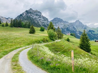 Von der Station St. Stephan hinauf in die Hauptstrasse und auf dem Trottoir nach links ins Dorf Grodei. Nun durch den Bifang bergwärts halten. Links und rechts des Strässchens stehen mehrere Simmentaler Häuser, die unsere Aufmerksamkeit verdienen. Dem Graben entlang durch Wald steil aufwärts in den Gandbodewald. Sanfter steigend wird dann die erste aussichtsreiche Terrasse oberhalb Gfellweideni erreicht. Nun gehts beinahe ebenen Wegs auf weichem Wiesenpfad zum Dachbode (nach Färmeltal/Stalde 30 min). Prächtiger Ausblick in den Lenker Talboden, ins Wildstrubel-Wildhorn-Gebiet, taleinwärts ins Färmeltal und zu den nahen Felsen der Spillgerte-Gruppe.