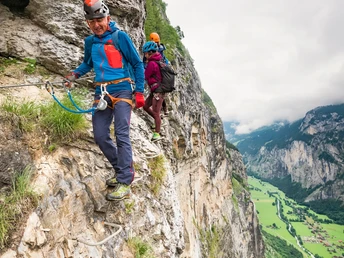 Auf diesem Klettersteig gewinnen wir nicht an Höhe. Im Gegenteil. Hier klettern wir nicht hinauf, sondern hinunter. Ausgangspunkt ist die Aussichtsterrasse Mürren, hoch über dem Lauterbrunnental. Genauer gesagt die Zwischenstation der Schilthorn Luftseilbahn, von wo wir in nur 15 Minuten den Einstieg zum Klettersteig erreichen. Dieser führt uns in rund drei Stunden über einen steilen Abgrund nach Gimmelwald – spektakuläre Aussicht auf die Berner Viertausender inbegriffen.