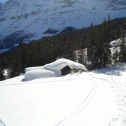 Vom Dorfzentrum Wengen führt ein relativ flacher Weg via Ledi zur Hunnenfluh. Unterwegs bietet der Weg atemberaubende Blicke ins Lauterbrunnental. Von der Hunnenfluh geniesst man eine tolle Aussicht ins Lütschental und weiter bis hinunter nach Interlaken. Ab hier wird es Zeit die Schneeschuhe umzuschnallen. Durch einen wildromantischen Wald steigt man anschliessend 20 bis 30 Minuten hoch zum Leiterhorn. Unterwegs bietet der tiefverschneite Weg Blicke auf Wengen und die mächtige Jungfrau. Ist das Leiterhorn erreicht, erwartet einem ein unglaublicher Ausblick auf die 4000er Bergkette und das tiefe Lauterbrunnental. Schwindelfreie erhalten auf der Nordseite einen imposanten, fast 700 Meter senkrechten, Blick hinunter nach Zweilütschienen. Der anschliessende Rückweg erfolgt via Ussri Allmi und Lägerweidli über einen nicht all zu steilen Waldweg hinunter nach Wengen.
