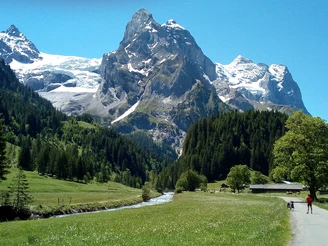 Vom Hotel Rosenlaui geht es kurz aufwärts zum Eingang der Gletscherschlucht. Nach Durchquerung der Schlucht (oder alternativ rechts daran vorbei) geht es kurz nach dem Ausgang über eine Brücke, welche sanft ansteigend (kurz bevor der Wanderweg in den Wald führt) zu einer Art kleinen Ebene, ein schöner Fleck für ein Picknick. Durch den Wald bergauf gewinnt man schnell an Höhe, wobei sich derBlick auf den zerrissenen und eindrücklichen Rosenlauigletscher autftut. Bei der Wegkreuzung P.1683 zweigt der weiss-blau-weiss markierte Alpinwanderweg zur Dossenhütte nach rechts ab. Wir gehen links auf schmalem Wege weiter. Dieser führt nun über glatte und abschüssige Felsen, hier ist Trittsicherheit gefragt. In einem weiten Rechtsbogen geht es um den Rosenlauistock herum und unter dem Ausläufer des Ochsentals weiter hinüber zur heimeligen und hübsch gelegenen Engelhornhütte. Von der Hütte führt ein Pfad hinab zum Graagistein und dann auf einer Alpstrasse zu den Alphütten Gross-Rychenbach. Auf einer Strasse geht es abwärts bis zur Brücke bei Gschwantenmad. Vor der Brücke halten wir uns links und erreichen so das Hotel Rosenlaui.