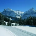 Von der Gondelbahn-Bergstation First zieht sich der mit Pistenfahrzeugen gespurte Winterwanderweg in grosszügiger Breite über den Hang nördlich des Berghauses. Nach einem kurzen, aber recht heftigen Anstieg gehts alsbald ebenen Wegs zur Gummihitta und, in leichtem Auf und Ab, weiter zum Bachalpsee. In der warmen Jahreszeit als blaues Juwel bekannt, fristet dieser im Winter unter einer dicken Eis- und Schneeschicht ein eher unscheinbares Dasein. Die unberührte Landschaft, die nur von vereinzelten Wildspuren und Skitouren-Linien durchzogen ist, übt jedoch gerade deshalb einen ganz besonderen Reiz aus.