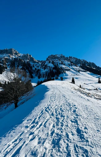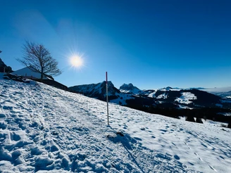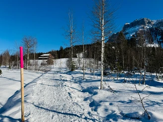Über die sanft abfallende Krete steigt man anschliessend hinunter zum Rotmoos, dem bekannten Naturschutzgebiet. Das verschneite, halboffene Gebiet lässt erahnen, wie einzigartig es hier im Sommer sein mag. Im Bereich des Sommerwanderwegs durchquert man das Rotmoos und via Hängstli und Dräcker geht es anschliessend zurück ins Innereriz.