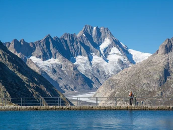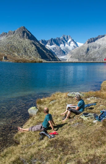 Ausgeruht geht’s angenehm ansteigend zur Triebtenseelücke, welche gleichzeitig auch die Kantonsgrenze Bern/Wallis ist. Ein letzter Blick zurück zu den Berner Hochalpen mit dem gewaltigen Finsteraarhorn und schon wechselt das Panorama in Richtung Südalpen. Der nachfolgende Abstieg zum Jostsee führt über sehr schön angelegte Pfade. Einzig im obersten Teilstück ist etwas Vorsicht geboten. Hier liegt oft sehr lange Schnee.