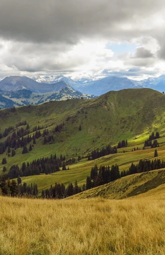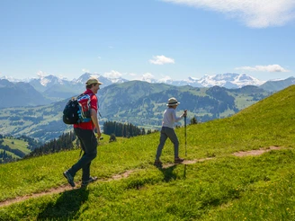 Von ehemaligen Berghaus Sparenmoos (1632 m) folgt man der Beschilderung Richtung Hundsrügg, welche zuerst leicht ansteigend über die Moorregion Tolmoos und Nüjeberg führt. Bei der Schiltenegg (P.1783) verlässt man die Strasse und steigt über den Bergrücken direkt auf den Gipfel des Hundsrügg auf. Hier geniesst man einen ersten Blick auf die Felstürme der Gastlosen. Nun gehts südwestwärts auf dem Grat weiter mit prächtiger Aussicht. Beim Sattel Luegle steigt man rechts haltend zur Alp Bire ab und folgt dem Höhenweg, an der Alp Vorderi Schneit vorbei bis zur Wegkreuzung Chaltläger. Bald erreicht man den grasigen Sattel bei P.1860, von wo man ein tolles Panorama auf den westlichen Teil des Berner Oberlandes bis zu den steilen Felsgipfeln Le Rubli und Gummfluh hat. Bald darauf ist das Obers Rellerli (1833 m) erreicht. Da 2019 der Betrieb der Rellerlibahn eingestellt wurde, fällt eine mögliche Einkehr im Bergrestaurant leider aus. Entlang der Rodelbahn beginnt der aussichtsreiche Abstieg über den Rellerligrat. Dieser verläuft weiter über die Alp Gspan (1552 m) bis Grüebli, wo man sich linkshält und so über Scharlotti nach Schönried absteigt.
