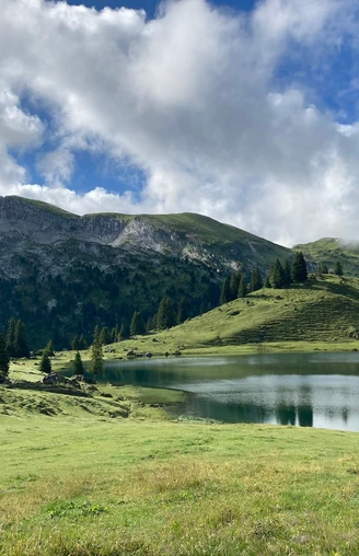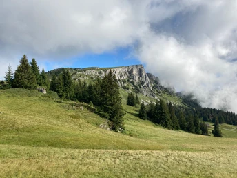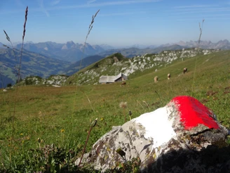 Auch während eines weiteren Kilometers muss die Alpstrasse benutzt werden. Auf der Höhe (über Urscher zum Seebergsee 3h15), wo die Strasse zu einer weiten Linkskehre ansetzt, schwenkt man auf einem Fahrweg rechts zum Gehöft ab. Direkt über die Egg ansteigend erreicht man bald die Gebäude auf Horenegg. Nun zieht sich der Fahrweg südwestwärts durch die sumpfige Hangflanke des Niderhorn-Ausläufers Richtung Dachweggraben, schwenkt vor Erreichen des Waldrandes südwärts um und folgt dem Grabenrand bis zur Vordere Niderhornalp. Herrlich ist der Ausblick zu den Gipfeln und Zacken des Voralpenbogens vom Stockhorn bis zu den Gastlosen. Man folgt nun einem über die Egg aufsteigenden Alpsträsschen und hält bei den Hütten am Hindere Niderhore im Zickzack auf den grünen Bergrücken des Niderhorns zu.Das Niderhorn ist ein äusserst vielseitiger Gipfel. Nicht allein Wanderer sondern auch Biker wählen ihn als Ziel. Und in seinen nach Osten abfallenden senkrechten Wänden tummeln sich die Kletterer. Besonders beglückend ist aber die einmalige Rundsicht. Man überschreitet den Höhenrücken südwärts, steigt an eindrücklichen Karrenfeldern vorbei zur Hütte Luegle ab und gelangt, bei Pkt. 1851 das Alpsträsschen kreuzend, durch einen Alpsattel zum von Fichten und Arven gesäumten Seebergsee. Zur Alp Stierenberg (Stierenseeberg) ist es nun noch ein Katzensprung.