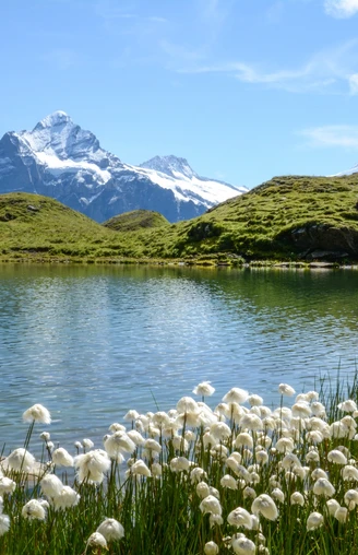 Bei der Bergstation First kann wer möchte erstmal seine Höhenresistenz überprüfen, indem man den kurzen aber luftigen Gang über den Cliff Walk macht. Zumeist auf einer Schotterstrasse wandert man anschliessend zum Bachalpsee. Die rund 100 Höhenmeter Aufstieg bis zu dem wunderschön gelegenen Bergsee sind aufgrund der Distanz von rund 3 km kaum wahrzunehmen. Der Bachalpsee besteht aus zwei Seen, zwischen denen man auf den kleinen Wiesenstücken sich sehr gut bei einer Pause vermachen kann. Der Blick über den kleineren, vorderen der beiden Seen in Richtung der Berner Hochalpen mit dem markanten Schreckhorn verspricht ein wunderbares Fotosujet.