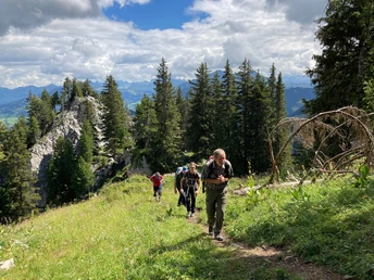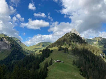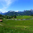 Vom Bahnhof Gstaad durch die Fussgängerzone zur Bahnüberführung und durch diese weiter zur Louwibachbrücke. Nun den Talboden westwärts queren und jenseits der Saane hangwärts ansteigen. Einem kleinen Bächlein entlang, durch Wald und über Weiden gewinnt man rasch an Höhe. Die letzten 100 Höhenmeter zum Haldisbärgli (Station Eggli) überwindet man in der Falllinie direkt neben der nur im Winter betriebenen Gondelbahn. Eine prächtige Rundsicht entschädigt für die Mühen des steilen Aufstiegs. Vielfältig sind die Ausblicke auf dem Höhenweg auf dem Kamm zwischen Chalberhöni und Meielsgrund. An den Hüt ten von Vorders und Hinders Eggli vorüber steigt man in die Flanke des bewaldeten Muttehubels. Nun senkt sich der Pfad in die Mulde vor der Alphütte Wilde Bode (nach Meielsgrund–Gstaad 2h, leider zur Hälfte auf Hartbelag; nach Gour de Comborsin–La Videmanette 2h20, Bergwanderweg), einer Einsattelung im Höhenzug zwischen Eggli und Gummfluh.