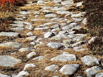 Rund 1000 Schritte trennen Münster von der südlichen Talseite mit der jungen Rhone und dem Rottenweg, der Ernen mit Oberwald verbindet. 100 bis 200 Höhenmeter höher zieht sich dann der schmale Waldweg durch den Hang. Auf dem weichen Boden läufts sich wie auf einem Teppich. Die Lichtungen geben die Sicht frei auf das Minstigertal vis à vis und auf die Dörfer Münster, Geschinen und Ulrichen, deren dunkle Häuser sich um die weissen Kirchen scharen. Dabei fällt westlich des Ulricher Flugplatzes ein See auf, der durch den teilweisen Abbau der Flugpiste geschaffen wurde. Das Aushubmaterial diente nach dem Lawinenwinter 1999 zum Bau des Schutzdammes bei Geschinen. Im Weiler Zum Loch, wo die Ägene und die Nufenenstrasse überquert werden, vereinigen sich Wald-, Rotten- und Saumweg und führen durch eine Feriensiedlung nach Obergesteln. Dieser Ort hebt sich mit seinem südländischen Baustil stark vom üblichen Gommer Ortsbild ab. Das Dorf wurde nach dem Grossbrand von 1868 schachbrettartig in Stein- Bauweise neu aufgebaut. Der alte Grimselweg steigt vom Ostrand über ein Flursträsschen sanft an bis zur Lawinenverbauung beim Milibach, durchquert den Schutzdamm und trifft nach einigen Zickzackkurven auf den Gommer Höhenweg (Pkt.1541). Hier weidet friedlich eine Herde Kälber und Rinder, deren Geläute eine feierliche Stimmung verbreitet, unterstützt vom Glockenschlag der Kirchen im Tal, das jetzt offen daliegt und sich durch seine Weite, seine Lieblichkeit und sein sattes Grün vorteilhaft von den benachbarten Alpentälern abhebt. Der weitere Aufstieg zeichnet zwei Schlaufen in den gleichmässigen Hang, der mehrfach von einer Alpstrasse durchschnitten wird. Lawinen haben die alten Bäume abrasiert, und nun versuchen kleine Birken und Lärchen das verlorene Gelände zurückzuerobern. Nach Altstafel lichtet sich der Wald und das grossartige Panorama mit den Muttehörnern, dem Piz Rotondo, dem Mittag- und Blinnenhorn wird sichtbar. Bewunderung wecken die «gebikkten» Wegabschnitte, die Jahrhunderte überstanden haben. Einmal sind es grössere und dann wieder kleine, flache Steine, die aneinander gereiht zu einer Bikki (Pflästerung) verlegt oder gestellt wurden. Chrizegge (2205 m) ist der höchste Punkt der Tour und der Übergang zur Hochfläche mit den von eiszeitlichen Gletschern rundgeschliffenen Felsenhöckern. Die Grimsel (2164 m) ist viel wilder als die Furka (2431 m) und bietet trotz der relativ geringen Höhe einen hochalpinen Eindruck. Der Totensee soll seinen Namen der Toten wegen erhalten haben, die nach der Schlacht von 1799 zwischen Österreichern und Franzosen ins Wasser geworfen wurden. Der Name wird jedoch schon 1760 erwähnt und bezeichnet vielleicht einen See ohne sichtlichen Zu- und Abfluss.