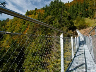 Von der STI-Haltestelle «Sundlauenen Dorf» geht es über Asphaltstrasse hinauf zur Seestrasse. Dort führt die Wanderroute durch den Wald nach Ruchenbühl – ein erster happiger Aufstieg ist vollbracht. Ein Wiesenpfad führt schliesslich zur Einseilbrücke. Hoch über den Sundgraben erhascht man auf Gitterros-ten stehend einen Blick auf den Thunersee. Die Hängebrücke führt die Wandernden in einer sanften Linkskurve und mittels Treppen wieder auf festen Boden hinauf ins Schatten spendende Waldgebiet Schwendi. Bevor es wieder aufwärts geht, führt die Strecke auf einer Holzbrücke über einen grösseren Bachlauf. Ohnehin ist der Weg nach Beatenberg gesäumt von vielen kleinen Wasserläufen, die eine zauberhafte Landschaft geschaffen haben. Es lohnt sich, hier oder dort einen Schritt weg vom eigentli-chen Wanderweg den Blick durch die lichten Äste auf die Region Thunersee oder die Spiegelwelten der kleinen Wasserstellen zu geniessen. Der grosse Teil dieses langen Waldabschnittes Richtung Beaten-berg ist geprägt von Treppenabsätzen. Der letzte Abschnitt hinauf nach Beatenberg Kirche führt über Wiesen.