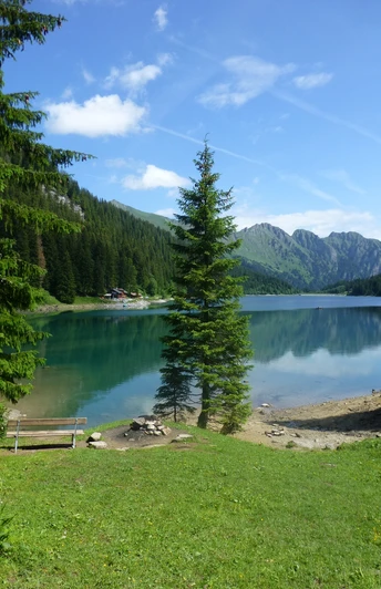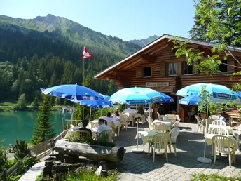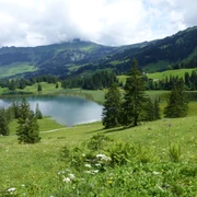 In leichtem Auf und Ab gehts über die Alpen Blatti (über den Blattipass nach Gsteig 2h) und Ober Stuedeli. Ein beeindruckendes Bild stiller Bergabgeschiedenheit geniesst man bei den Hütten auf Alp Seeberg (nach Chalet-Vieux–Lac Retaud–Col du Pillon 2h15; über Unter Stuedeli zum Arnensee 30 min). In der Tiefe liegt der waldgesäumte Arnensee, dahinter ist der tiefe Taleinschnitt des Tschärzisbachs zu ahnen; die wuchtig aufragenden Staldeflüe begrenzen den Horizont. Steil ist der Abstieg zum Arnensee. Dem östlichen Ufer entlang führt der Weg am «Huus am Arnensee» vorüber hinauf zur Alphütte Unter Stuedeli. Durch Bergwald gehts anschliessend hinunter nach Linders Vorschess am Tschärzisbach und beinahe ebenen Wegs nach Schwänd, wo der recht steile Abstieg nach Feutersoey beginnt.
